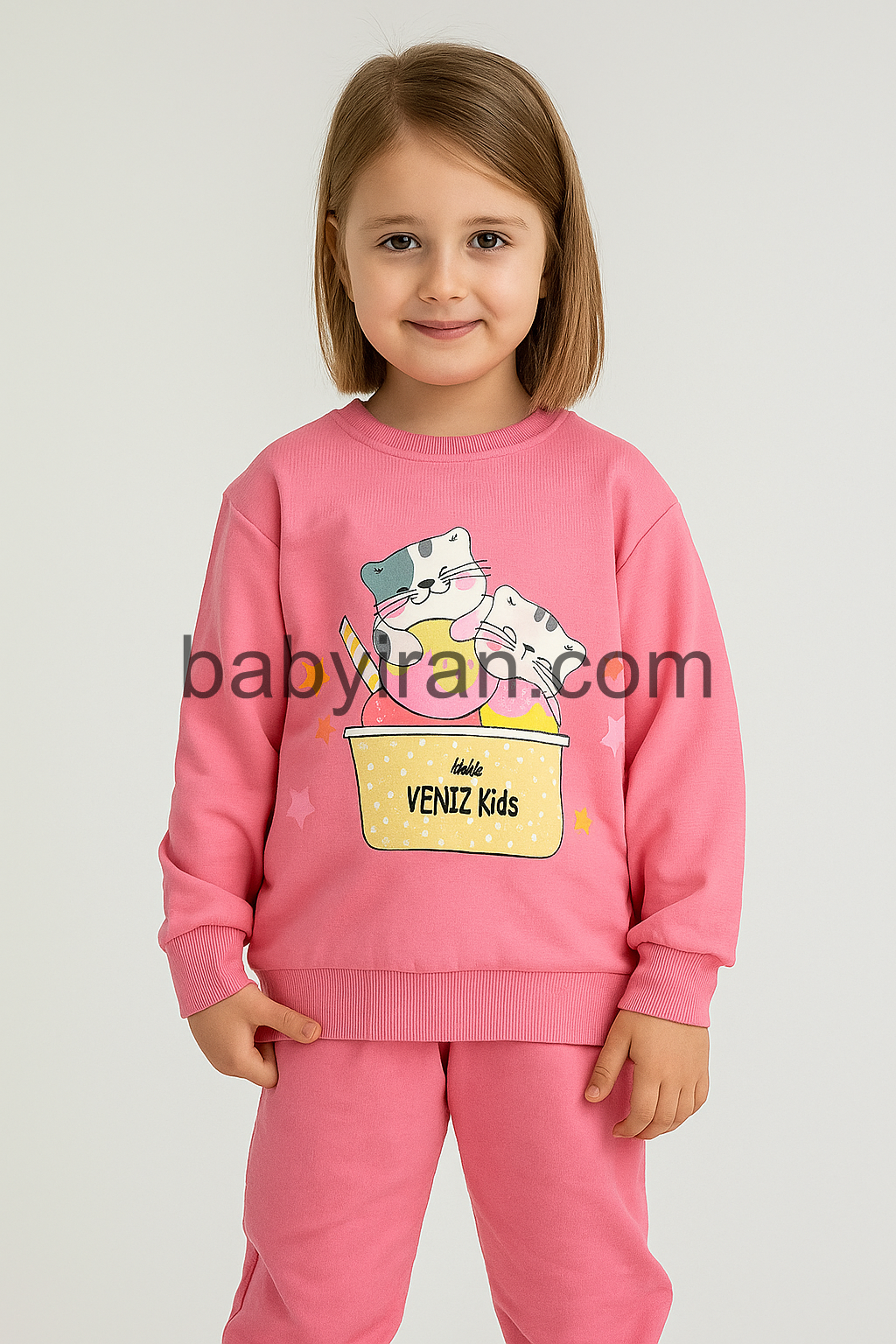 لباس دخترانه شیک و جدید پارچه لاکرا طرح گربه‌های بامزه VENIZ Kids یک انتخاب دوست‌داشتنی و خاص برای دختر بچه‌های2 تا 8 سال است. این ست صورتی‌رنگ با طراحی کودکانه و چاپ گرافیکی فانتزی گربه‌های بازیگوش در بستنی، حس شادی و انرژی را به کودک منتقل می‌کند.