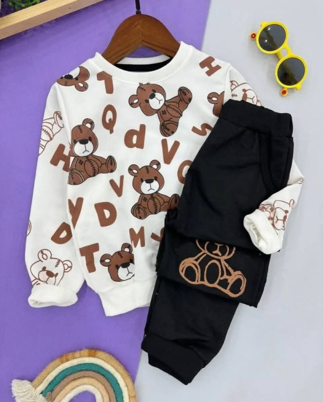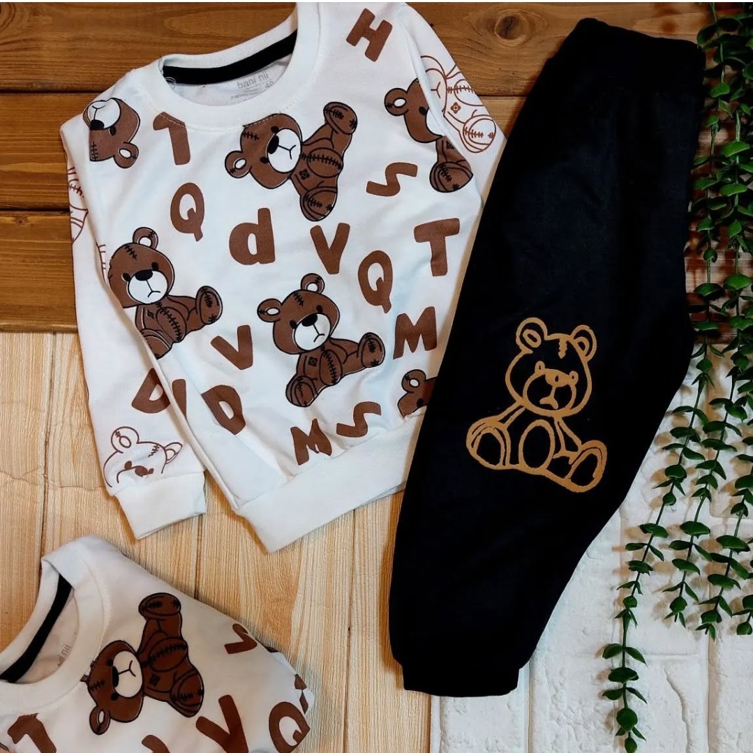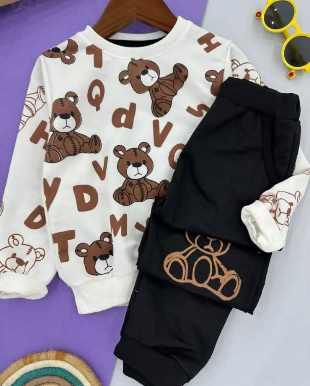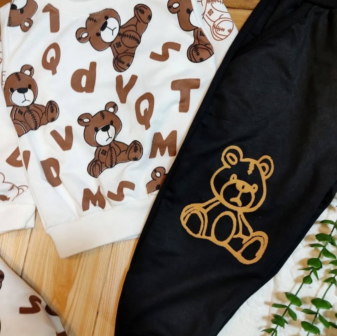 ست بلوز و شلوار بچگانه پسرانه – طرح خرس عروسکی و حروف انگلیسی