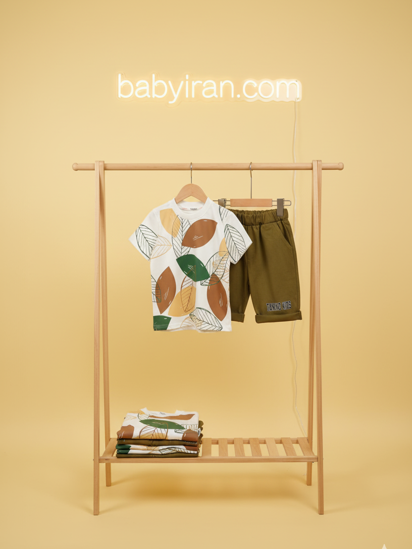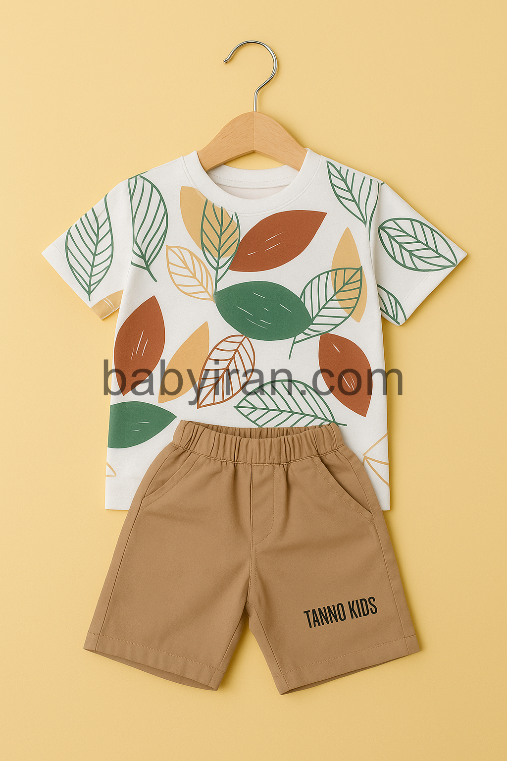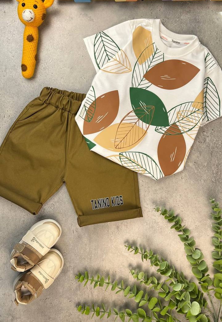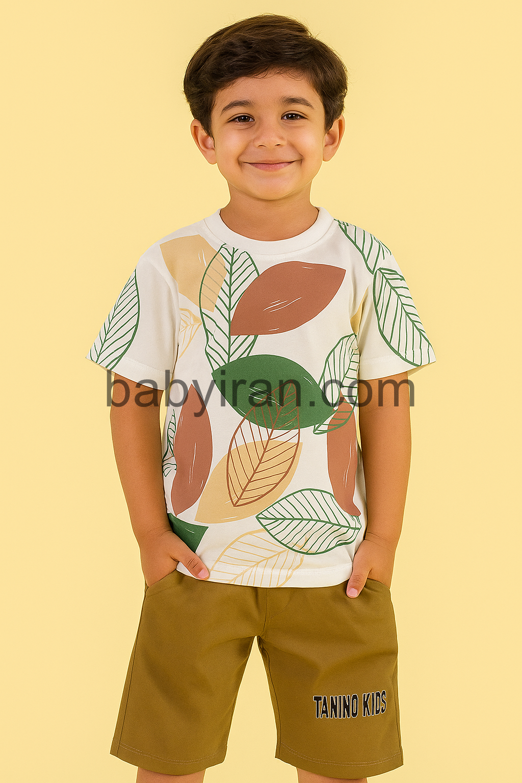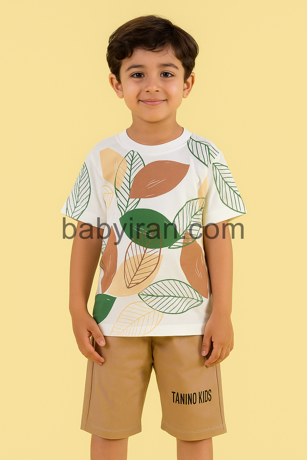 "ست شیک و راحت پسرانه – تی‌شرت طرح برگ رنگی + شلوارک کتان تابستانی"