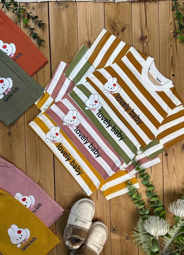 "خرید ست بچگانه تابستانی – تیشرت پنبه‌ای راه راه و شلوارک کتان | طرح خرگوش کیوت | موجود در ۴ رنگ (زرد، صورتی، سبز، قهوه‌ای)"