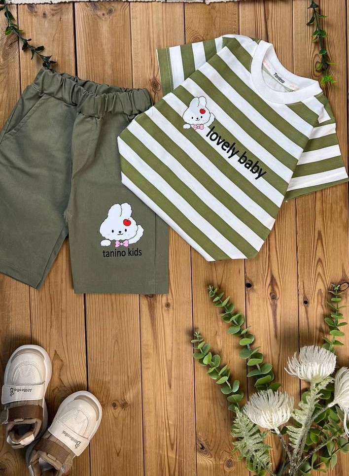 تیشرت شلوارک تابستانی بچگانه  شامل تیشرت پنبه‌ای نرم و ضد حساسیت همراه با شلوارک کتان خنک و مقاوم. طراحی فانتزی خرگوش بامزه در ۴ رنگ جذاب (زرد، صورتی، سبز، قهوه‌ای). مناسب  2 تا 7 سال."